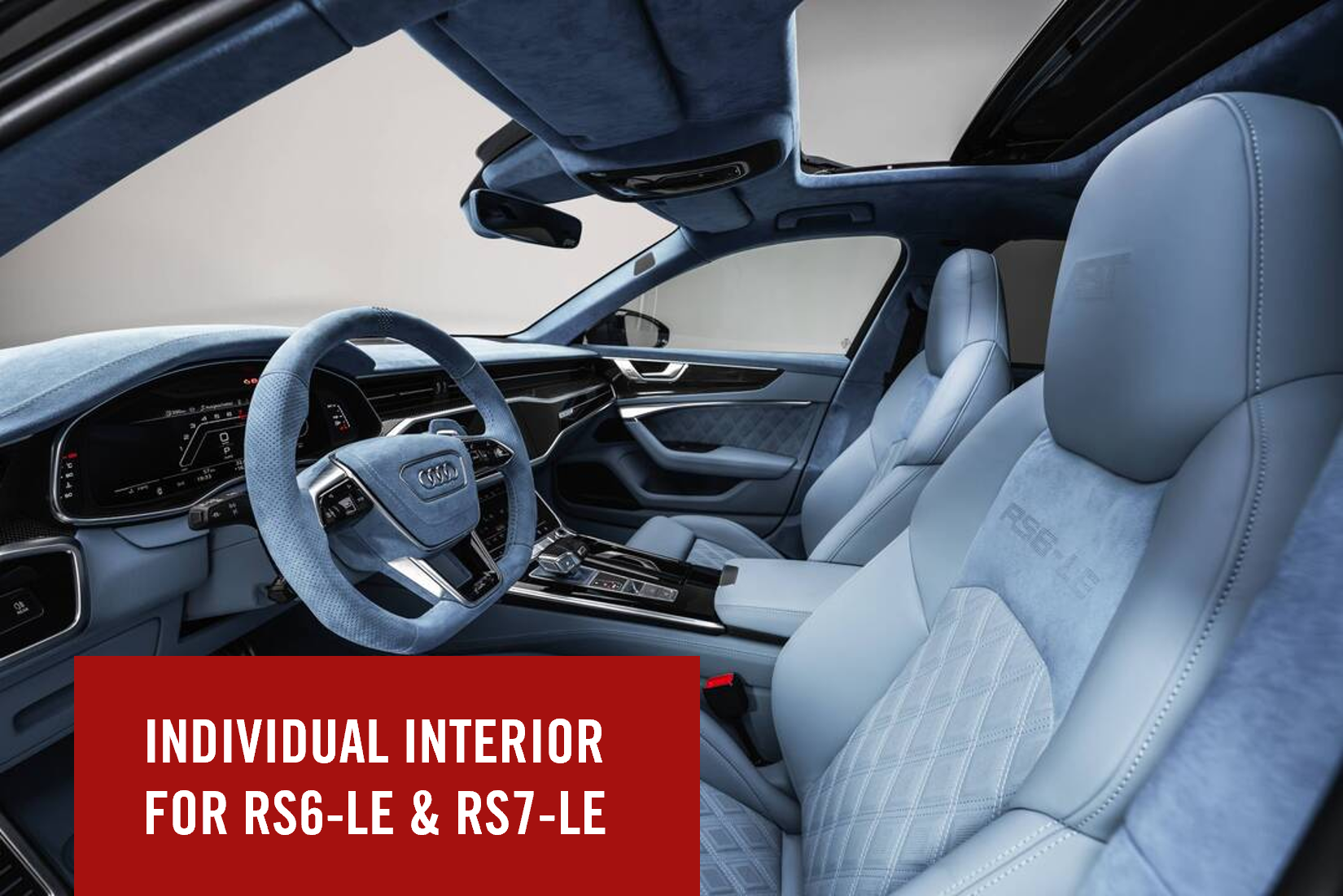 Striking components of the ABT aerodynamic kit, all in matte visible carbon fiber, dominate the exterior appearance. Particularly characteristic are the Legacy Edition-typical bonnet inserts, which also provide engine bay ventilation. A front lip with RSQ8-LE lettering, mirror caps, and fender extensions further accentuate the vehicle’s commanding front presence. Front skirt add-ons including air intake grilles not only emphasize the sporty, massive profile but also ensure improved cooling through optimized airflow.
